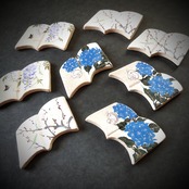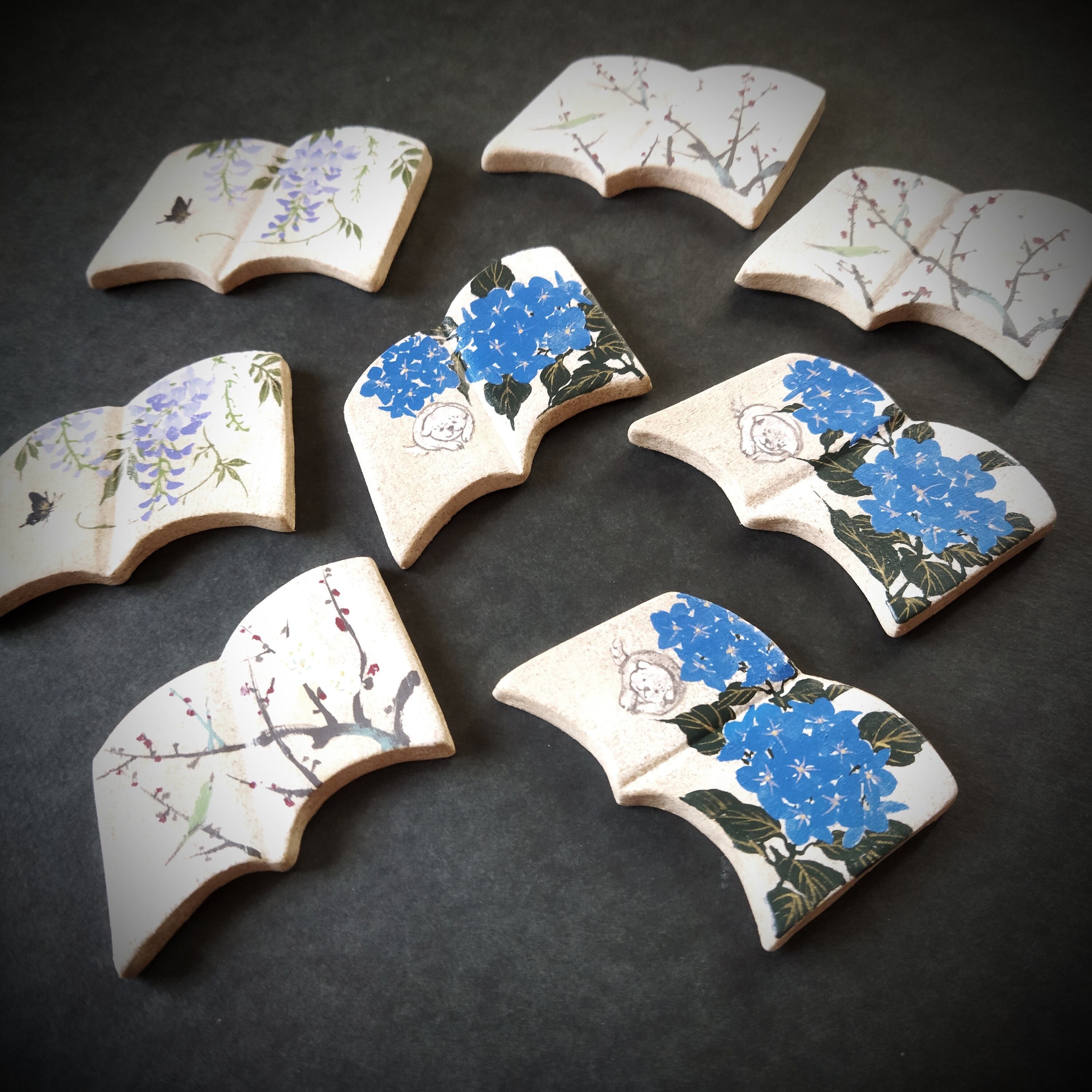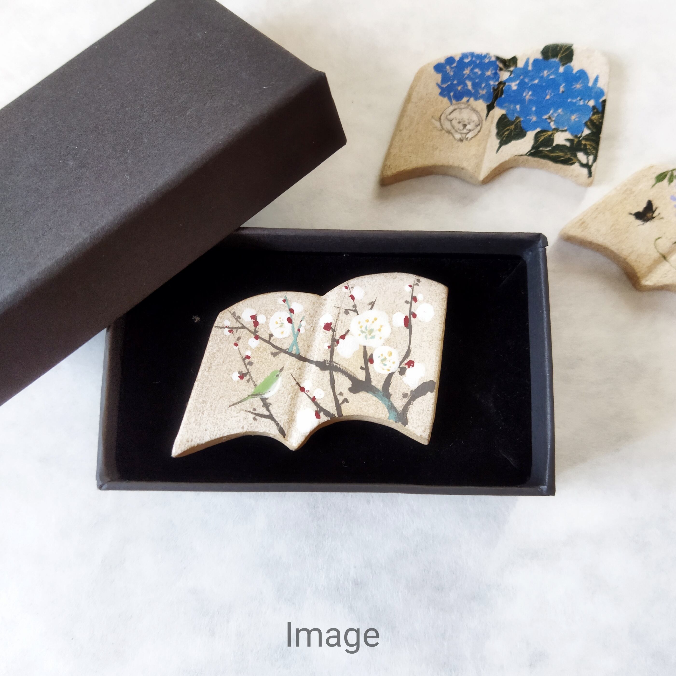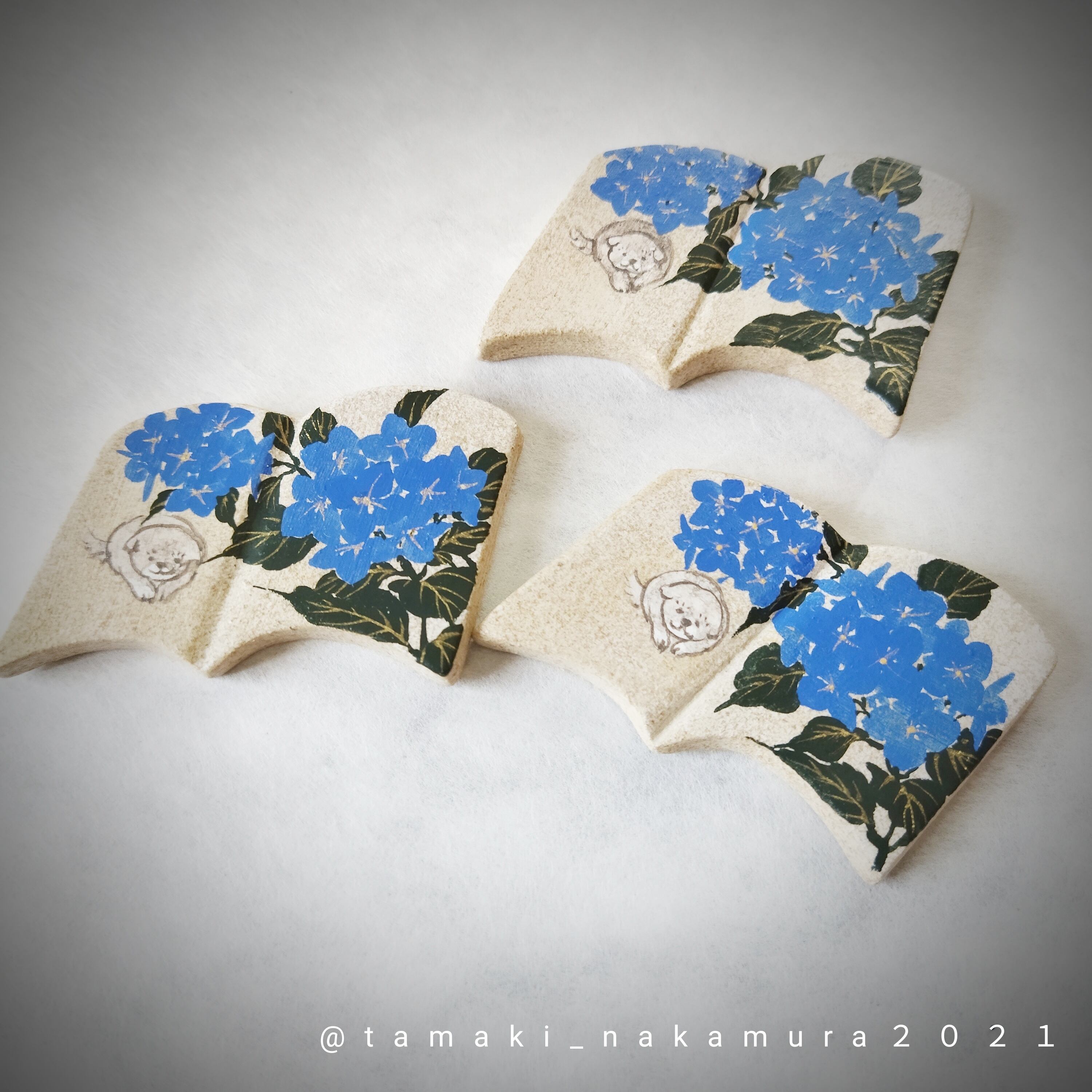 オーブン陶土で作った土台にアクリルガッシュで手描きしております。